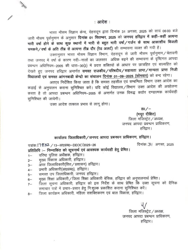 जनपद हरिद्वार में कल सभी स्कूल और आंगनबाड़ी रहेंगे बंद,,जिलाधिकारी मयूर दीक्षित ने जारी किए आदेश, आपदा प्रबंधन अधिनियम के तहत कड़ा अनुपालन सुनिश्चित,,रेड अलर्ट का असर :