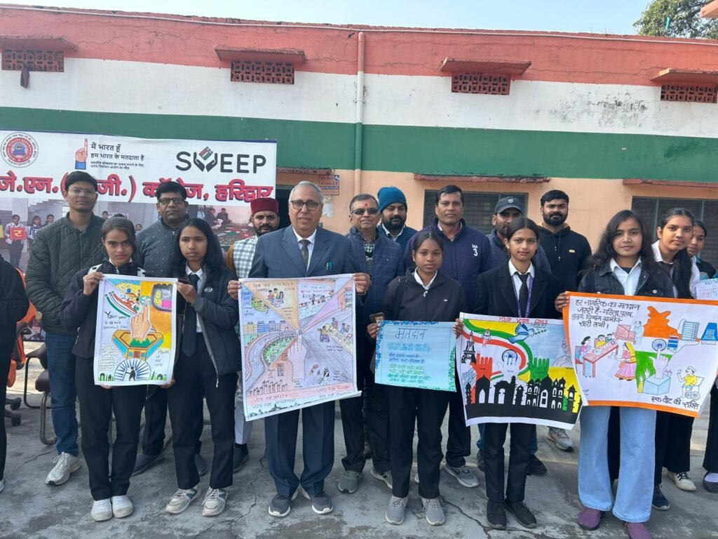 एस.एम.जे.एन. पी.जी. कॉलेज, हरिद्वार में आज राष्ट्रीय मतदाता दिवस के अवसर पर आंतरिक गुणवत्ता आश्वासन प्रकोष्ठ, निर्वाचन साक्षरता क्लब, स्वीप तथा राष्ट्रीय सेवा योजना के संयुक्त तत्वावधान में भव्य मतदाता जागरूकता कार्यक्रम का आयोजन किया गया।