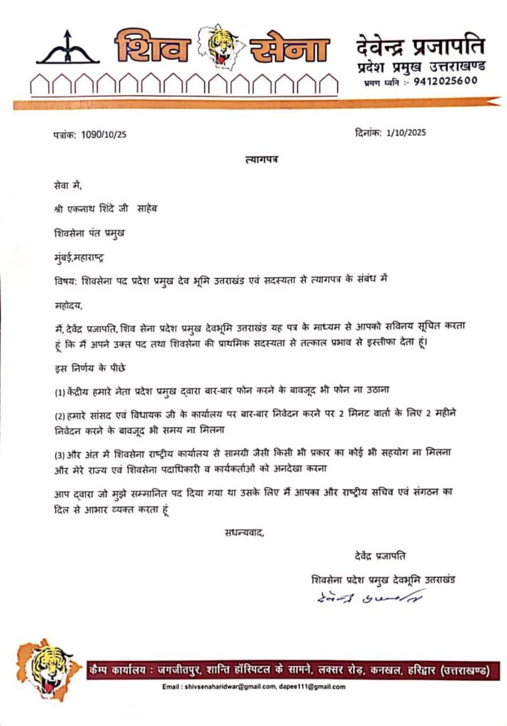 देवेंद्र प्रजापति ने बताया कि 1.10.2025 से शिवसेना और राष्ट्रीय पदाधिकारी से संगठन के विषय में वार्ता चल रही थी प्रजापति ने बताया कि संगठन के शीर्ष नेतृत्व को उत्तराखंड में शिवसेना कैसे स्थापित हो सकती है उसके विषय में अपनी राय भी दी गई थी जिस पर संगठन शिष्य नेतृत्व ने ध्यान नहीं दिया इन सब चीजों पर अपने उत्तराखंड पदाधिकारी से वार्ता कर देवेंद्र प्रजापति ने शिवसेना प्रदेश प्रमुख के पद से अपने समर्थकों के