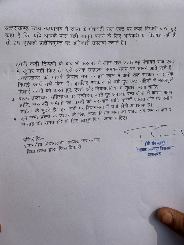 ज्ञापन जिलाधिकारी हरिद्वार को सौंपते हुए अनुरोध किया गया कि इसे मुख्यमंत्री कार्यालय तक शीघ्र प्रेषित किया जाए। ज्ञापन की प्रति विधानसभा अध्यक्ष को भी भेजे जाने की जानकारी दी गई है।